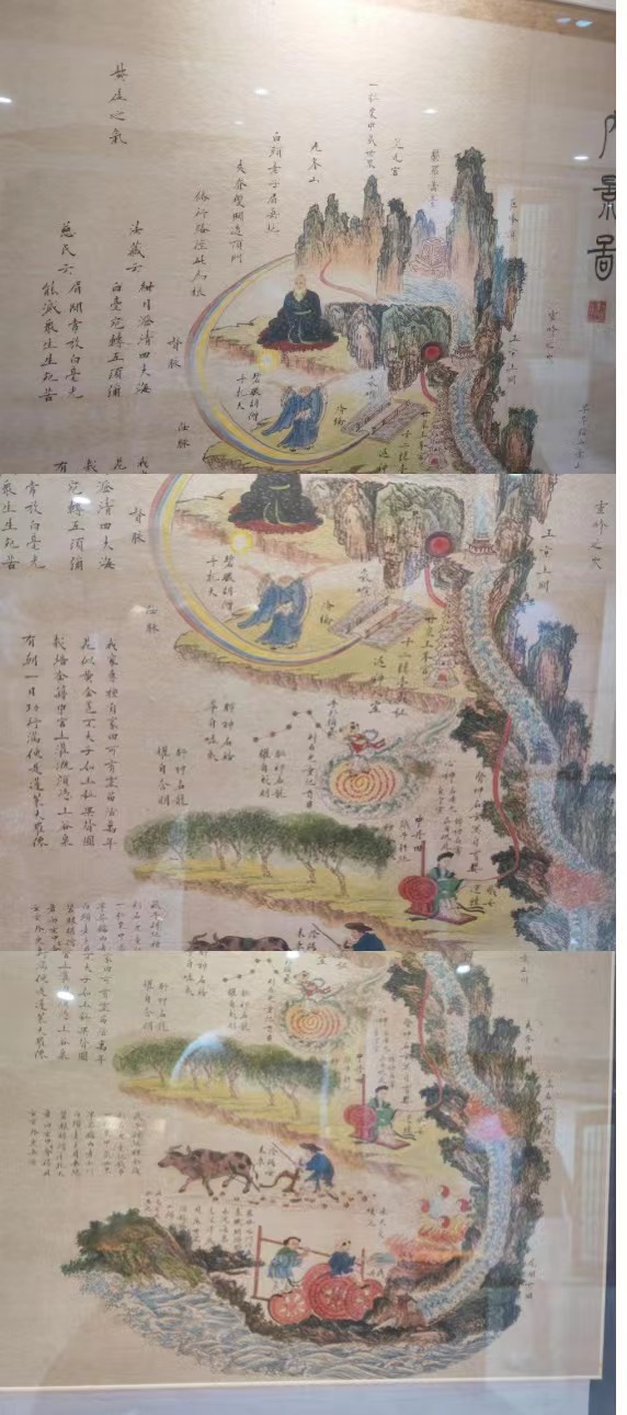 這幅圖足足有一人高的圖名為《內景圖》又名《內經圖》,它被譽為“中華養生第一圖”,展示了氣機循行路徑。《內景圖》形象生動地抓住了人體主要的“三關、三丹田”,記述了修煉的主要過程。圖畫以山水畫的形式指代丹道修煉中人體器官的功用、不同身體部位的作用,揭示了天人合一的自然真諦。