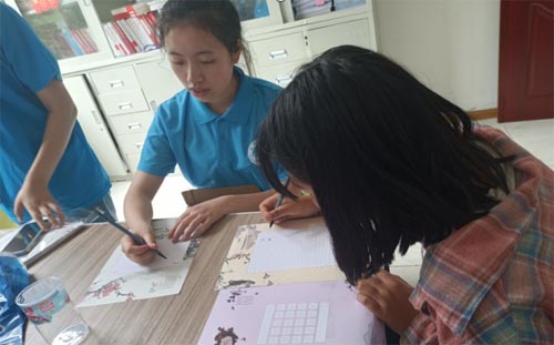 為弘揚中華優(yōu)秀傳統(tǒng)文化,并同時增強留守兒童的愛國熱情,團隊開展了書法練習(xí)、編織中國結(jié)等活動。每一個隊員積極參與其中,隊員之間配合默契,隊員和孩子們一起寫字、做手工,與孩子們相處融洽,營造了濃厚的文化氛圍。團隊成員在村委會活動室與孩子們一起用古詩詞來練習(xí)書法,手把手教授孩子們編織中國結(jié),剪窗花,輔導(dǎo)孩子們的學(xué)習(xí)功課,每一位隊員都飽含熱情,孩子們也樂在其中,感受到了中華優(yōu)秀傳統(tǒng)文化的魅力。