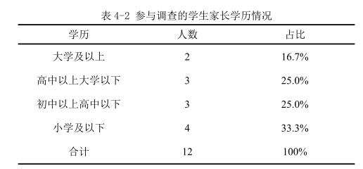 大學(xué)生支教活動(dòng)不僅給當(dāng)?shù)貙W(xué)校、教師以及學(xué)生帶來積極影響,也會(huì)給學(xué)生家長帶來一定的積極影響。而且這類家長文化水平不高,如下表所示是本次調(diào)研中 12名家長的學(xué)歷情況。