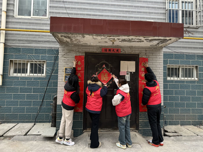 圖為實踐團成員:王睿欣、孫瀅惠、翟文涵、孫啟碩在社區貼春聯