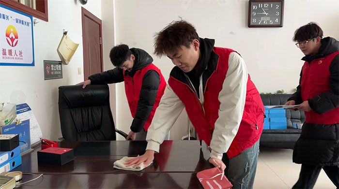 在社區服務者的安排之下,志愿者換茶換水,對辦公室的綠植進行澆水護理,地面桌椅進行擦拭擺正,將服務衣物進行疊放,志愿者們熱情高漲、干勁十足,經過幾個小時的努力,辦公室環境煥然一新,贏得了村書記的等人的一致好評!