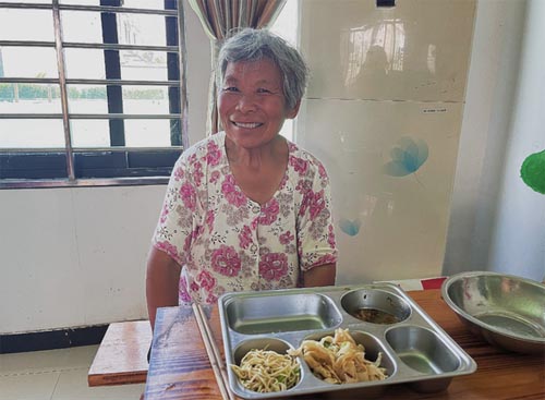 隨后,團隊成員對助餐點內用餐的老年人進行采訪,詢問他們對菜品的滿意程度及日常用餐體驗。“我年紀大了,平時做飯買菜都不方便,社區(qū)食堂離得近,不用自己在家里燒飯,一頓飯就10塊不到,多方便。”76歲的張奶奶向小隊成員展示了她的午餐:清炒豆芽、百葉包菜和豉汁雞。她還說:“我們口味淡,這邊食堂的飯少鹽、少油,很合我的胃口。”