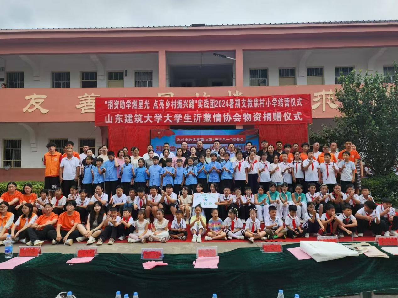 最后,焦村小學舉辦了“捐資助學燃星光,點亮鄉村振興路”實踐團2024暑假支教焦村小學結營儀式和山東建筑大學大學生沂蒙情協會物資捐贈儀式。2024年8月山東建筑大學大學生沂蒙情協會攜學為貴教育集團、社會愛心人士等捐贈打印機書1250本、鋼筆510支和墨水、羽毛球拍11副、筆記本500個。
