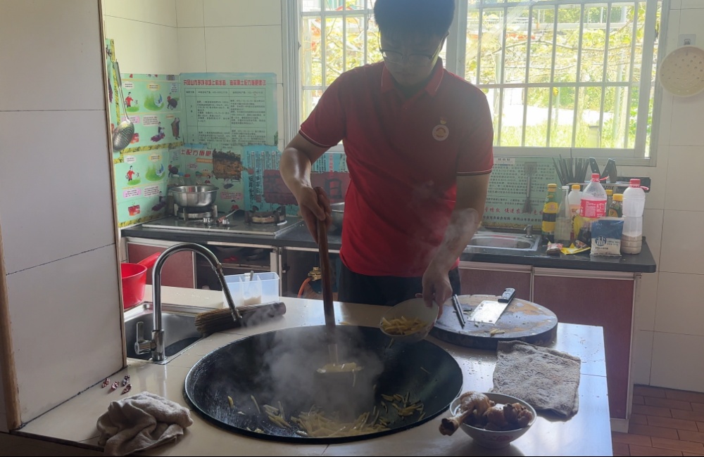 跨越三公里綠水青山,團(tuán)隊(duì)抵達(dá)壩上紅軍村。老鄉(xiāng)提前備好新鮮食材,隊(duì)員們迅速分工:年輕姑娘們準(zhǔn)備碗筷,小伙子們劈柴生火,有烹飪經(jīng)驗(yàn)的劉宇同學(xué)系上圍裙掌勺,嫻熟地翻炒著土豆絲,灶膛里柴火噼啪作響,鐵鍋上熱氣升騰,飯菜的香味彌漫在屋中,贏得了眾人的稱贊。