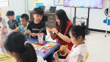 另一邊,9歲的阿澤專注搭建花籃,將吸管彎折、穿插,認真調(diào)整每一根的角度。“老師,花籃能裝小花嗎?”他舉著半成品詢問。隊員點頭鼓勵,“當(dāng)然!你的花籃可以裝滿創(chuàng)意小花”。阿澤眼睛一亮,用彩紙剪出花朵裝飾,完成后興奮地展示:“這是送給社區(qū)花園的禮物!”孩子們用吸管拼搭出圓球、花籃,還有造型各異的小動物,在互動交流里,把普通材料玩出無限可能。