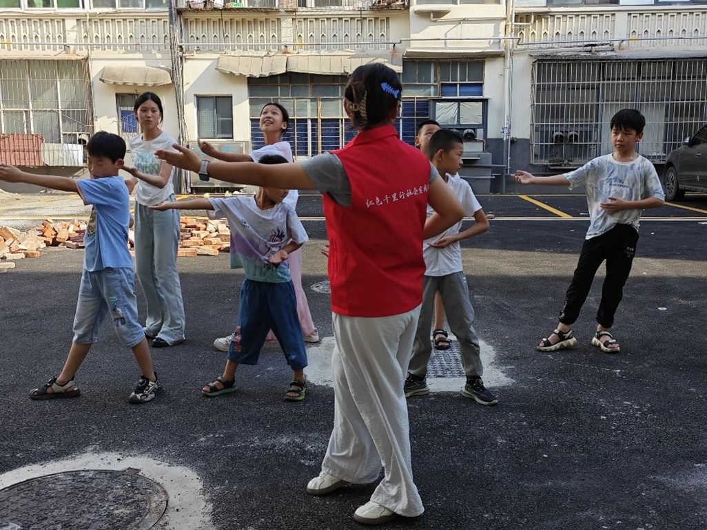 “左手如抱球,右手慢慢推......”在戶外場地上,志愿隊員帶領孩子們練習太極九式。他們解釋道:“紅軍用草藥強身,我們用太極健體,健康是革命的本錢。”一招一式間,傳統文化與紅色精神得到了完美融合。
