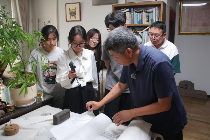 在訪談環節,徐偉先生從家族傳承脈絡講起,細致講述了徐氏傳拓從祖輩初創到如今的發展歷程,他提到,傳拓看似是簡單的“復制”,實則暗含對文物的敬畏——不同材質的石碑、青銅器,需要搭配不同韌性的紙張和調制比例的墨汁,甚至連捶打的力度都要根據紋路深淺精準把控,稍有不慎便可能損傷文物原貌。這些藏在細節里的講究,讓隊員們第一次意識到,這項技藝不僅是手藝,更是對歷史遺存的溫柔守護。
