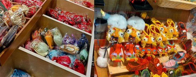 隨后,老師重點為同學們展示了一項復雜而精美的技藝——虎頭帽的制作過程。從布料的選擇、剪裁,到刺繡虎頭五官的精細針法,再到填充棉花和香料的技巧,老師一步步耐心演示,栩栩如生的虎頭形象在她手中逐漸成型。老師解釋道,虎頭帽寓意著保佑孩子虎頭虎腦、健康成長、驅邪平安,每一針每一線都凝聚著長輩對孩童的深切關愛和美好祝福。同學們還觀摩了工作室里其他形態各異的香包配飾,老師逐一講解了諸如蓮花(寓意純潔)、福袋(寓意聚福)、粽子(寓意高中)等造型的美好寓意,讓大家深刻體會到民間藝術中“圖必有意,意必吉祥”的文化內涵。