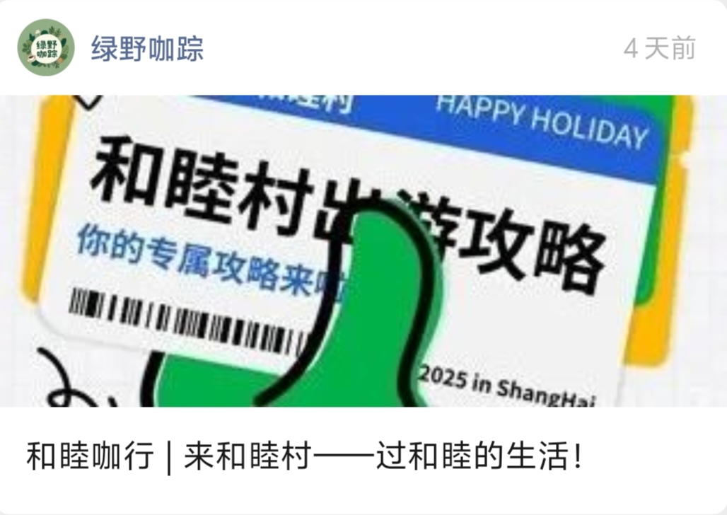 同時,團隊注冊運營“綠野咖蹤”微信公眾號,整合村咖地圖、周邊業態、鄉村文化故事等信息,發布《東厙咖行|在青浦東厙,把日子過成心里的模樣》《和睦咖行|來和睦村——過和睦的生活!》等3篇鄉村旅游攻略推文,累計瀏覽量超500人次,點贊轉發量破百,成為城市游客了解鄉村的重要窗口。目前已有2家村咖主動合作張貼公眾號二維碼,形成“到店消費—線上導流—全域體驗”的服務閉環。