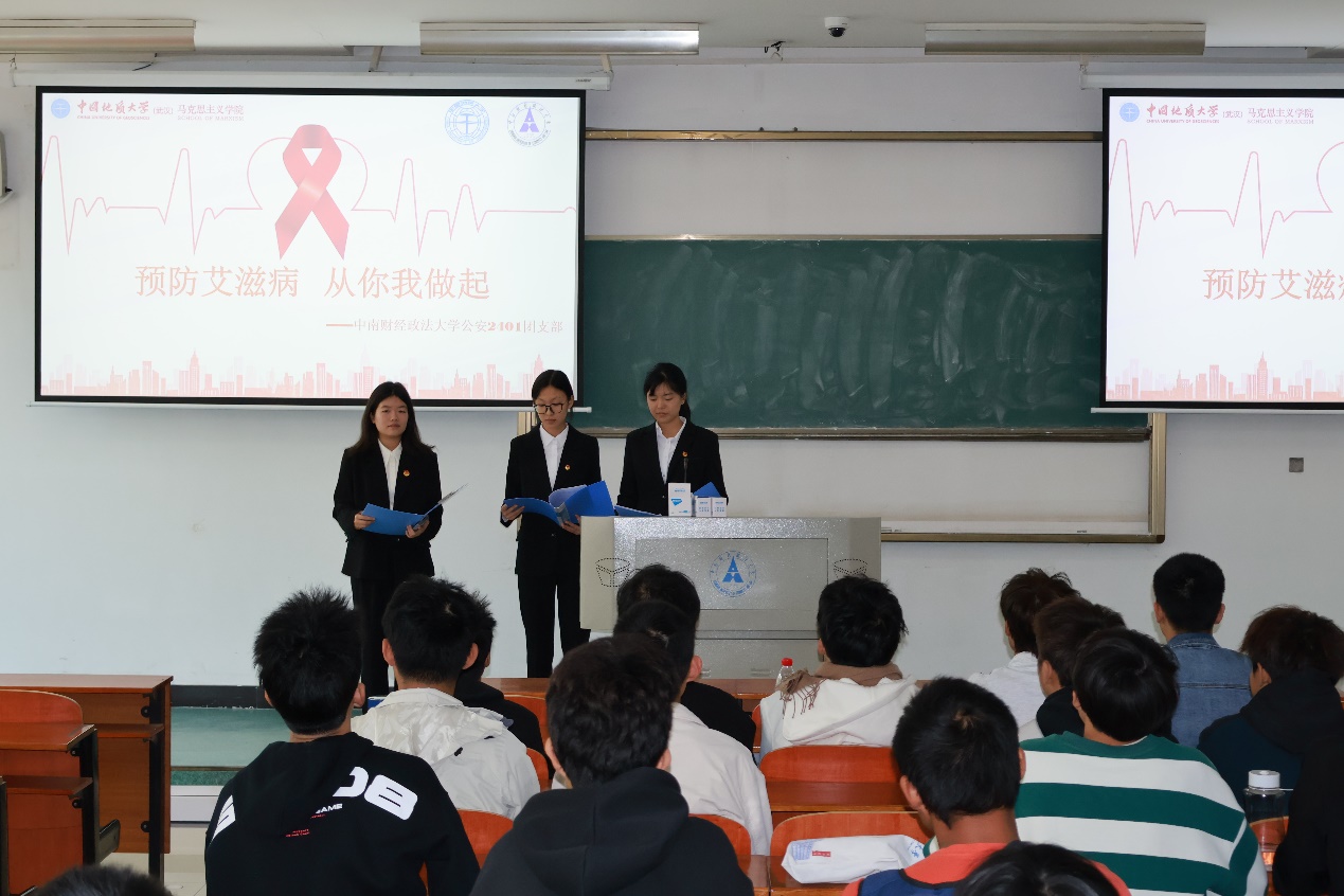 2024年11月5日10點,馬克思主義學院第十五期紅色之聲“沃原奮蹄”團隊在中南財經政法大學南湖校區文波211進行了主題為“守護生命,共抗艾滋”及“三牛亦解韶光貴,不等揚鞭自奮蹄”的線下宣講,團隊成員許安琪、王一諾、房柯希擔任主講人。中南財經政法大學公安2401團支部參與本次活動,共計38名同學。