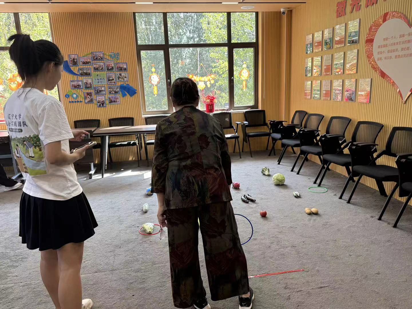 圖為團(tuán)隊(duì)成員與老年人進(jìn)行“果蔬套圈”活動(dòng)
