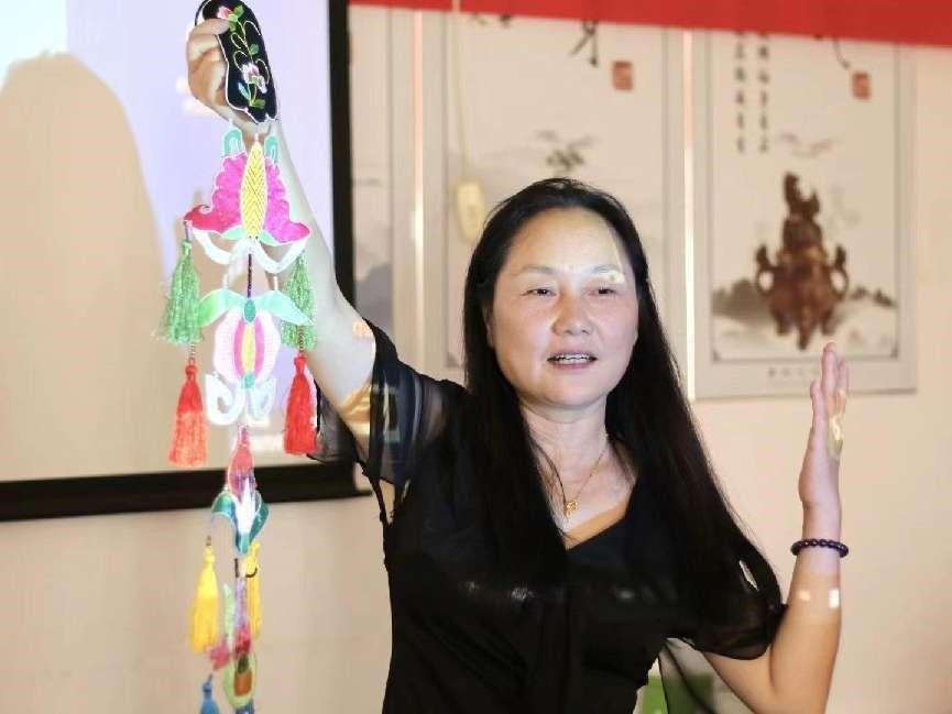 圖為陽新布貼非遺傳承人向?qū)嵺`隊員展示布貼實物——飄帶。 甘樂 供圖