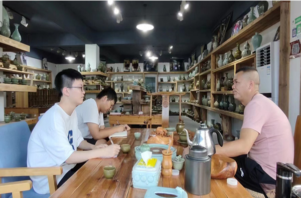 “我們的龍泉青瓷在工藝上有發(fā)生什么變化?國家和社會給予了哪些有利政策?”“我們的技藝在傳承的過程中遇到哪些困難?龍泉青瓷未來該如何創(chuàng)新性發(fā)展?”在龍泉市寶溪鄉(xiāng)溪頭村,龍泉青瓷是村子的金名片,圍繞龍泉青瓷的傳承發(fā)展,團隊成員和龍泉青瓷傳承人金朝軍進行了深入的交流。他在訪談中表示,近年來龍泉青瓷的發(fā)展得到了政府和社會各界人士的大力支持,寶溪鄉(xiāng)不僅推進了青瓷的傳承和保護,還依靠青瓷帶動了鄉(xiāng)村振興。此外,金朝軍還強調(diào),“推進龍泉青瓷的創(chuàng)新性發(fā)展,還需不斷研制契合年輕人需求的瓷器,加入更多的現(xiàn)代元素”,這種在傳承傳統(tǒng)文化中自覺推進文化創(chuàng)新的認識給團隊成員留下了深刻印象。