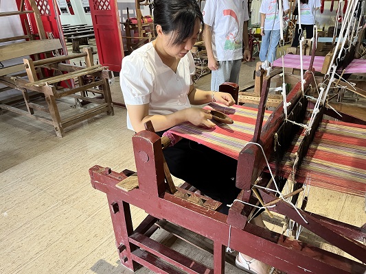 圖為劉倩老師向團隊成員演示粗布的基本制作原理及方法。