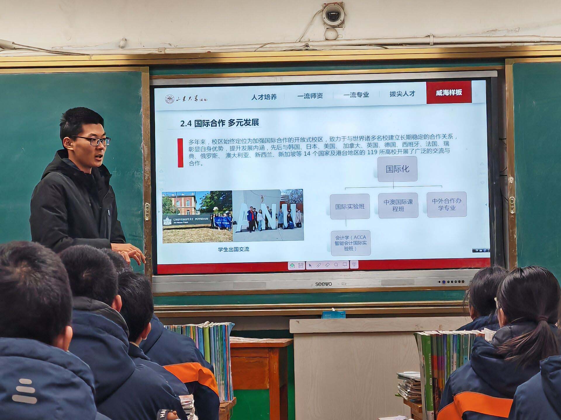 隨后,宣講團成員李欣芮前往煙臺二中進行回訪宣講,按照既定計劃,進行了母校參觀、師生座談會、同學交流會等多樣化的活動。在班級宣講環節中,李欣芮介紹了山東大學(威海)的招生政策、學院與專業設置等基本情況,全方位向同學們展示了校園的美麗環境與深厚文化底蘊,鼓勵大家積極報考。宣講現場的同學們積極填寫意向報名統計表,傳閱招生簡介宣傳頁、宣傳冊等,熱情十分高漲。