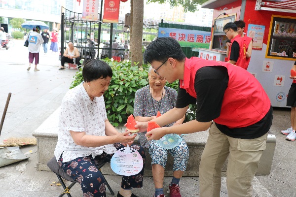 滿懷熱情的安師大學(xué)子們在社區(qū)的廣場上搭起了先鋒驛站,擺上了解暑的西瓜和綠豆湯,成了社區(qū)里不一樣的一道風(fēng)景。志愿者們的熱情和活力吸引了許多的老年人,他們便笑著迎上去遞過西瓜和綠豆湯,將清涼送進(jìn)長者的手中,將溫暖送進(jìn)長者的心里。安師大學(xué)子們不僅在先鋒驛站中為大家送清涼,他們更是走出廣場,走近社區(qū)街道,為更多的老年人送去溫暖和清涼,用自己的雙手傳遞愛心,用自己的雙腳走近他人。