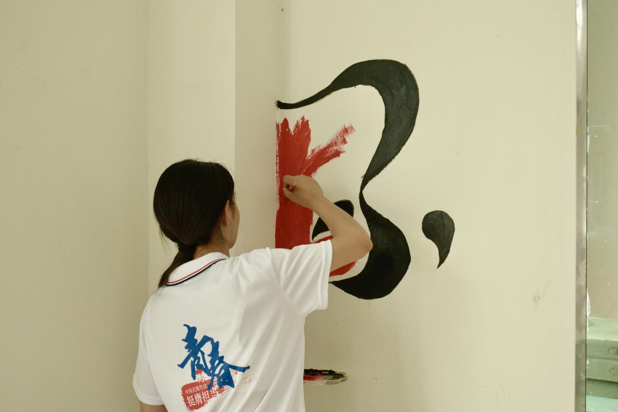 在學(xué)校老師的帶領(lǐng)下,團(tuán)隊(duì)成員行走在寂靜的校園中。志愿者們分工合作,最大限度地發(fā)揮自己的專業(yè)優(yōu)勢。白墻上的一筆一畫,卵石上的天馬行空,指尖中的一剪一劃,都詮釋著志愿者對傳統(tǒng)文化的理解和對非遺的熱愛。