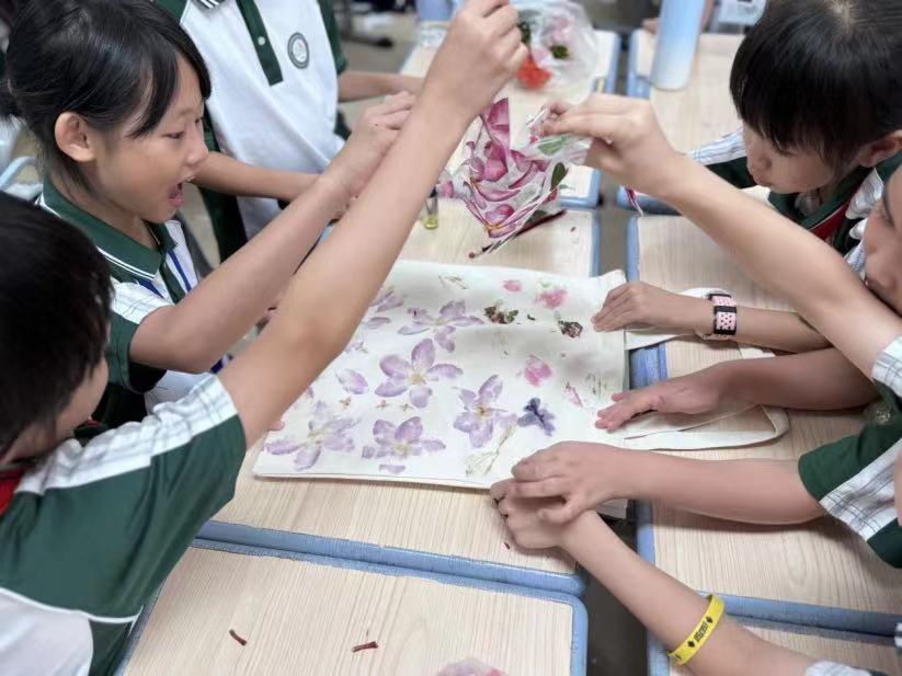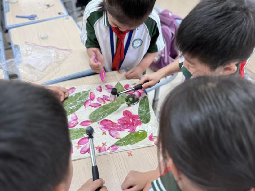 在創作過程中,部分小組也遇到了一些挑戰。比如,有的植物葉片太脆,輕輕一敲就碎裂開來,需要重新挑選和嘗試;不同種類的植物在敲打后留下的色彩深淺不一,需要調整力度才能達到理想的效果等。小組導師發現后及時與學生們進行溝通,并與學生們共同找到了解決方法。這些小插曲不僅考驗了師生們的應變能力,同時也增加了活動的樂趣,也讓學生們更加珍惜手中的來之不易的勞動成果,重視每個小組的實踐作品。