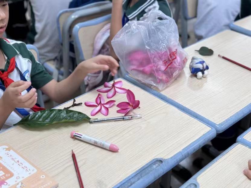 活動前期,宣傳組組員根據活動方案有條不紊地開展準備工作,并向學生們發出了一項特別任務,即利用課余時間,在校園內外收集形態各異、色彩豐富的植物。學生們興致高昂,與家長共同搜集了許多美麗的花葉準備著活動的到來。在活動當天,導師們把教室布置成了一個臨時的工作坊,將桌椅整齊排列成幾個長方形,桌上擺放著學生們挑選的各種植物。宣傳組組長陳一寧向學生們介紹此次活動的流程,并向每組分發準備好的拓印工具包,其中包括小錘子、一碗鹽水、剪刀和膠帶等。