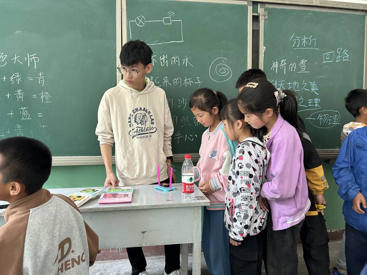 到下午后教學工作正式開始,我們的實踐活動從科學實驗開始。在一間簡陋的教室里,我們用簡單的實驗器材為孩子們展示了科學的神奇魅力。比如,用醋和小蘇打制造出的化學反應,讓孩子們驚訝得張大了嘴巴;用氣球和塑料瓶演示的空氣壓力實驗,引發了孩子們的熱烈討論。看著他們專注的神情,我們仿佛看到了未來的科學家正在萌芽。我們耐心地為他們講解實驗原理,鼓勵他們自己動手嘗試。孩子們的積極性被充分調動起來,他們在實驗中感受到了科學的樂趣,也激發了他們對知識的渴望。