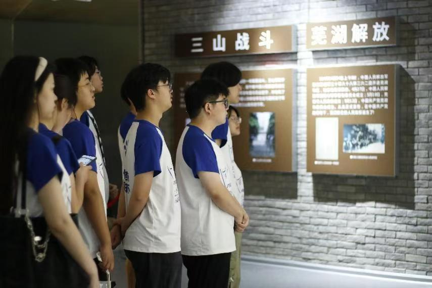 在講解員的帶領下,團隊依次從第一展廳走到第四展廳,認識和了解了不計其數(shù)的烈士事跡,其中不乏有安徽早期學生運動的領導人、土地革命時期中共安徽黨的主要領導之一王步文、中國共產黨創(chuàng)建時期重要的領導人之一、中國革命青年熱愛的導師和領袖者惲代英、面對敵人威逼利誘,始終堅貞不屈,在獄中作下“忍看山河碎?愿將赤血流”浩然正氣的詩句的呂惠生、渡江戰(zhàn)役中冒槍林彈雨運送大批解放軍戰(zhàn)士和物資的馬毛姐和車勝科、以胸膛堵住敵人槍口、犧牲時僅19歲的入朝志愿軍李家發(fā)等等在一定時期做出卓越貢獻的烈士,團隊還了解到,館內收藏的年齡最小的一名烈士承小多,因奮不顧身搶救落水兒童而獻出生命,犧牲時年僅12歲。