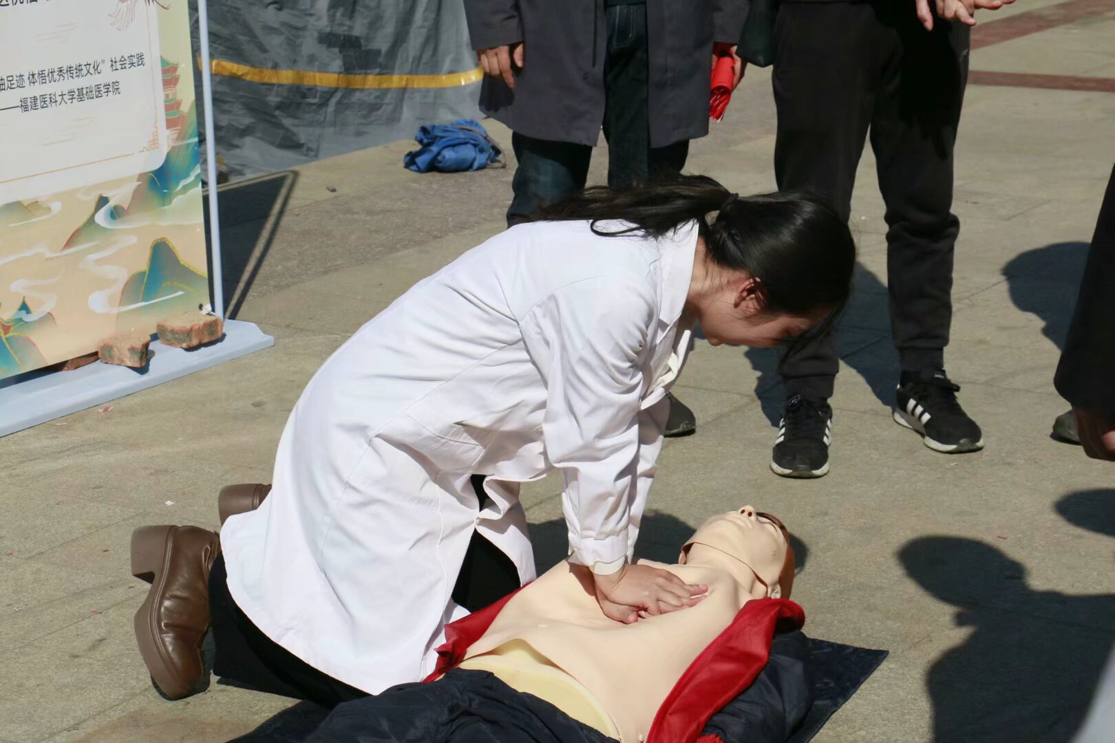 活動中,實踐隊隊員柯宇彤以貼近村民生活的視角,針對日常生活中頻發的肚子痛問題,進行了生動詳盡的科普講解,深入淺出地引導村民們認識腹痛的多樣成因及科學應對之策。緊接著,實踐隊成員與指導老師攜手,給當地村民和福建水利電力職業技術學院的老師們現場演示了心肺復蘇術,細致入微地講解了實施心肺復蘇的關鍵注意事項及標準操作流程,強調了急救技能在關鍵時刻的重要性。此外,實踐隊還精心安排了急救包扎知識的講解,讓村民掌握簡單的應急處理措施。