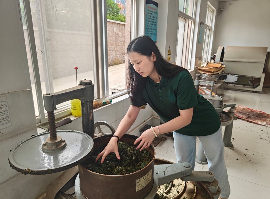 最后一站,實踐團進入制茶車間,學(xué)習(xí)綠茶、紅茶等不同品類茶葉的加工工藝與機械設(shè)備操作,并親身參與茶葉制作流程。通過實地體驗,同學(xué)們深刻感受到生態(tài)種植模式在品牌打造和市場溢價中的重要作用,了解到消費者對綠色防控產(chǎn)品的高度認(rèn)可,從而對茶產(chǎn)業(yè)全鏈運作模式形成更直觀、系統(tǒng)的認(rèn)知。