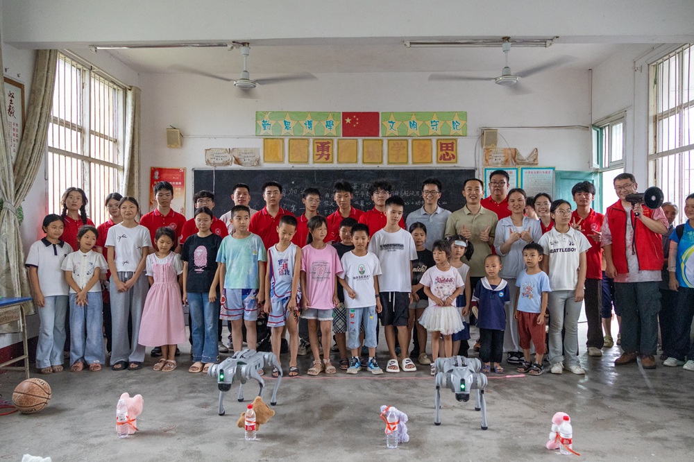 離開面條廠房,實踐隊來到東陽村小學。在開展積木拼裝活動前,隊員們特意帶來了機器狗表演,瞬間點燃了孩子們的熱情。機器狗隨著指令做出前進、跳躍、跳舞等動作,靈活的身姿引得孩子們陣陣歡呼。這場充滿科技感的表演,讓孩子們近距離感受到了科技的魅力。