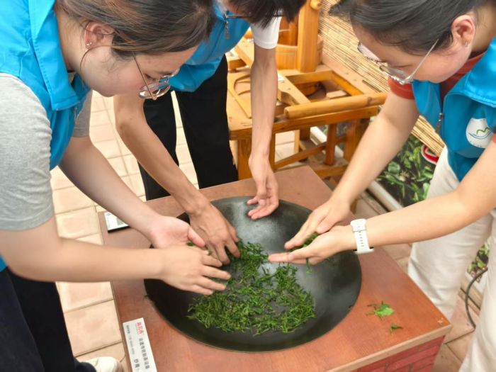 7月18日清晨,露水還凝在茶芽上,尹經理已帶著我們走進茶園。指尖掐住一芽一葉輕輕一提,嫩綠色的希望便落進竹簍——這是我人生中第一次采茶,指腹沾染的茶香,比任何香水都更清冽。走進制茶工坊,百年傳承的制茶工藝正在老師傅的手中流轉。攤晾臺上,鮮葉舒展著身軀,靜靜散發水汽;殺青鍋旁,高溫與茶葉碰撞出帶著草木香的白煙,師傅的手在鍋中靈活翻動,汗珠順著臉頰滑落,滴在青石板上洇出深色的印記;揉捻時,茶葉在掌心漸漸成形,茶汁滲出的澀香里,藏著植物最本真的力量;最后一道干燥工序,將水分抽離的茶葉蜷縮成精巧的模樣,鎖住一整個春天的芬芳。尹經理說:“這四步工序,少一步則香不醇,多一步則味過澀。”我們跟著學做綠茶時,總在揉捻的力道上把握不準,老師傅便握著我們的手示范:“要像對待孩子似的,既要用力,又得心疼。”后來學做紅茶,看著茶葉在發酵中染上溫潤的紅褐色,才懂得同一片葉子在不同工藝里,竟能綻放出如此迥異的風味。