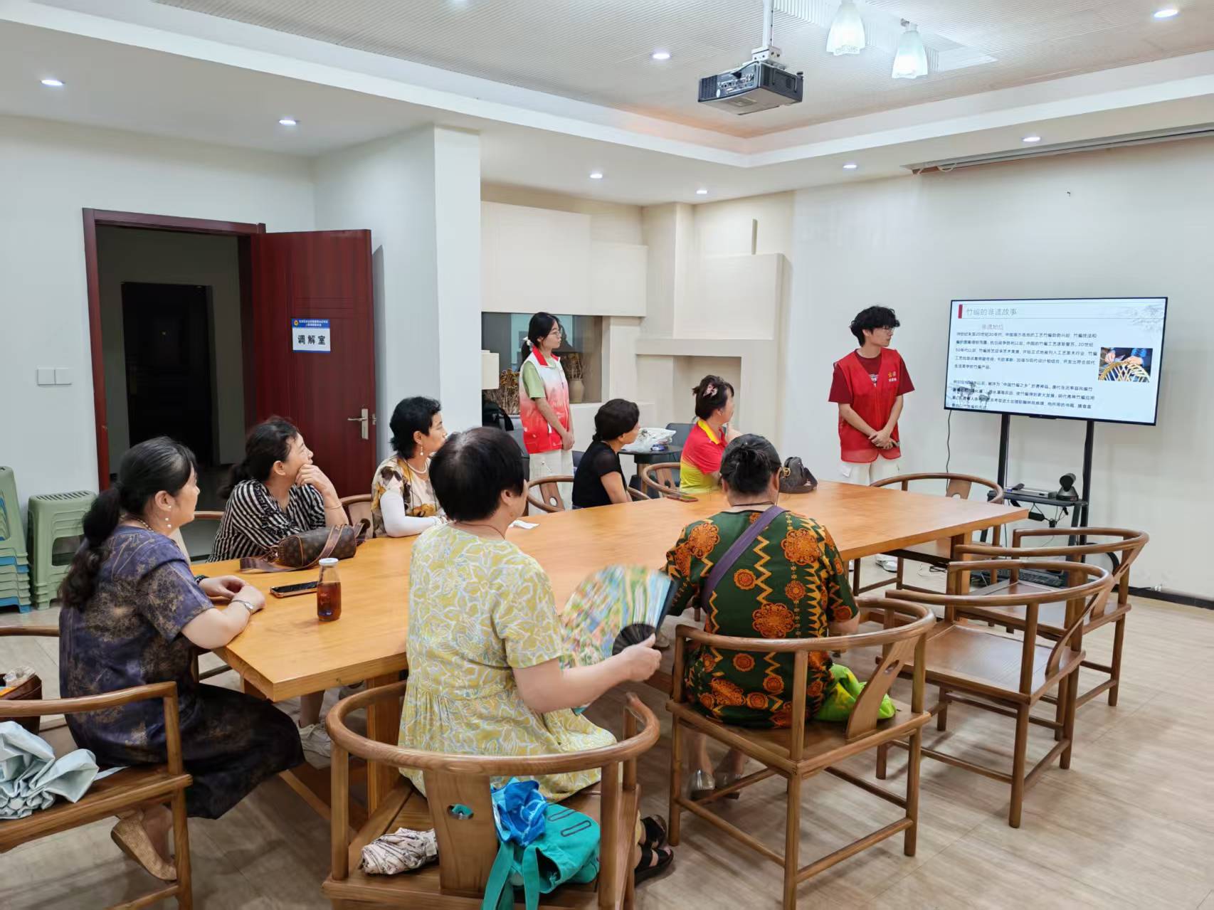 志愿者首先走上前,向老人們介紹竹編扇的悠久歷史。“竹編扇在古代是文人雅士喜愛的風雅之物,后來逐漸在民間流傳開來,成為大家常用的實用工藝品……” 志愿者通過大屏幕展示出一幅幅竹編扇的歷史圖片,老人們看著圖片,聽著講解,不時發出贊嘆聲。