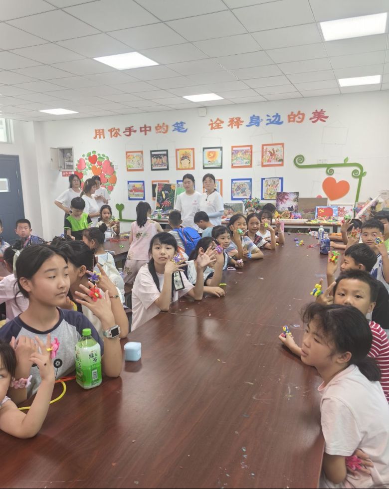 活動現場,志愿者小老師和孩子們圍坐在一起。在制作扭扭棒作品時,小老師們手把手指導,從扭扭棒的彎折塑形到色彩搭配,一步步帶領孩子學習與探索。孩子們手中的扭扭棒像被施了魔法,一只只靈動的花朵戒指、一朵朵別致的花朵手環漸漸成型。現場氣氛熱烈。專注的神情、嘗試新造型時的興奮,讓課堂滿是童真與活力,在鄉村夏日繪出創意滿滿的畫面。