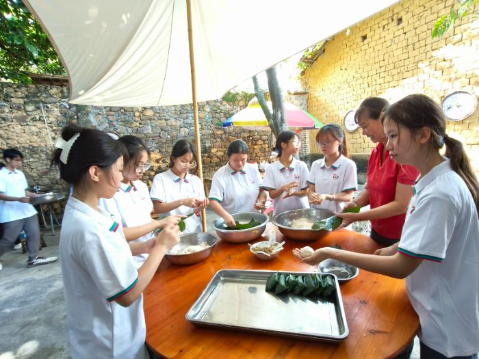 實踐團在當地村民的指導下學習制作蕉葉粑粑 段秀錦 劉佳鳳 唐煒琪攝