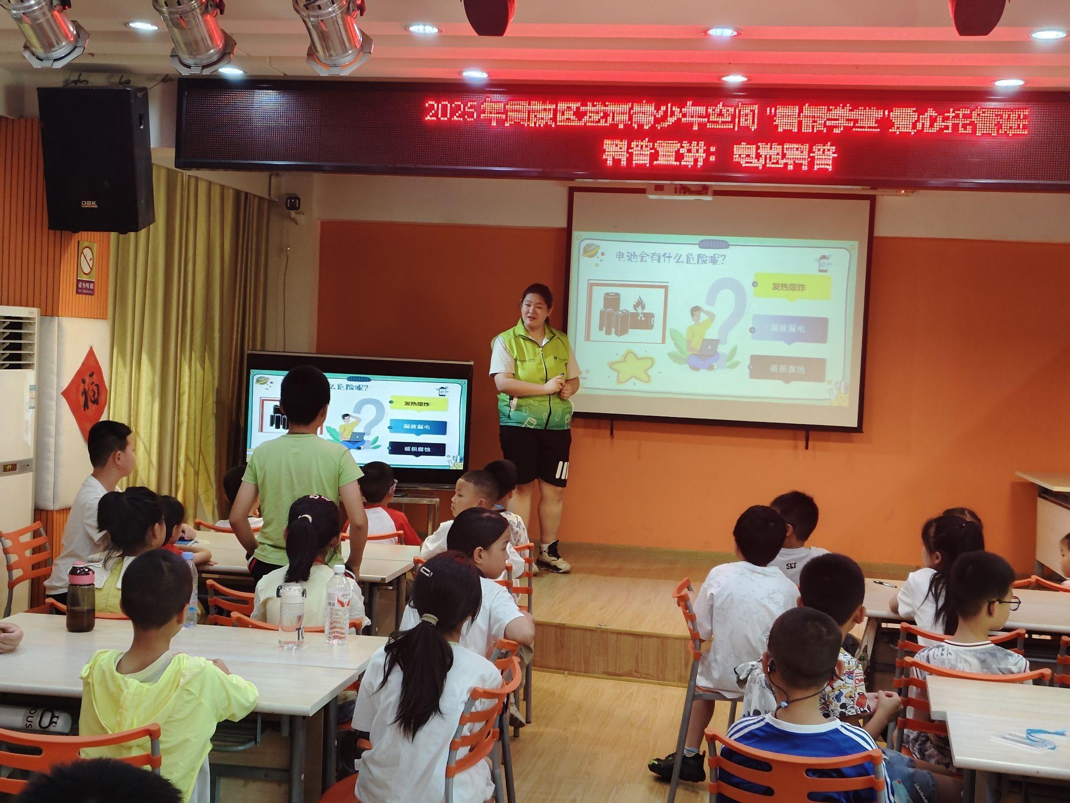 7月10日上午,實踐隊抵達黃陂區社區活動中心后,宣講環節由兩名隊員主導,其余隊員在旁輔助配合。主講隊員以“電池的秘密”為主題,結合實物展示生動講解不同電池的特點和用途,從家用遙控器里的干電池到新能源汽車上的動力電池,用生活中的例子幫助孩子們理解。講解到廢電池危害時,隊員們通過“土壤污染對比圖”“小動物生存環境”等案例,讓孩子們直觀感受隨意丟棄電池的危害。過程中,輔助隊員適時舉起對應電池實物配合展示,還不時用眼神和手勢與主講隊員互動,提示調整節奏,確保孩子們聽得懂、感興趣。