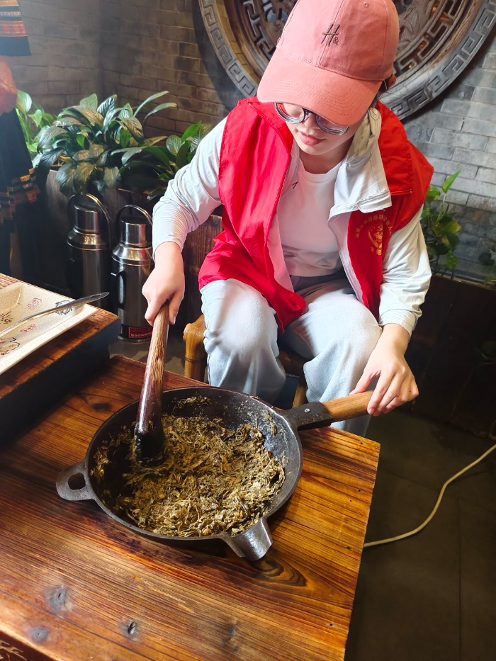 實踐團第二戰來到恭城瑤族自治縣民族產業展示中心,與非遺恭城油茶縣級傳承人劉老師深入交流。“恭城油茶”不僅是自治區級非物質文化遺產,更是瑤族人民日常生活的必備飲品。在交流過程中,非遺恭城油茶縣級傳承人劉老師說到:“恭城油茶起源于唐代瑤族先民應對潮濕瘴氣的生存智慧,至今已有千年歷史。恭城油茶是恭城的文化名片,我希望通過大家的努力,讓這張名片更加亮麗,讓油茶文化走向全國,走向世界。同時,我也希望更多的年輕人能夠加入到油茶文化傳承的隊伍中來,讓這技藝在新時代煥發出新的生機與活力。”傳承人向成員們詳細演示了油茶制作的六道核心工序:從最初的用開水浸泡茶葉5-10分鐘,到洗凈茶葉;從燒熱茶鍋放入少許食油,到放入茶葉、生姜、蒜米并反復捶打;最后加入開水和精鹽,整套流程一氣呵成,力道與火候的把握盡顯功力。實踐團成員們沒有止步于觀摩。在傳承人的指導下,實踐團成員們親手嘗試捶打技巧,成員們親自體驗了炒茶、捶打、過濾等工序,深刻感受到了恭城油茶"一杯苦、二杯呷(澀)、三杯四杯好油茶"的獨特風味和文化內涵。
