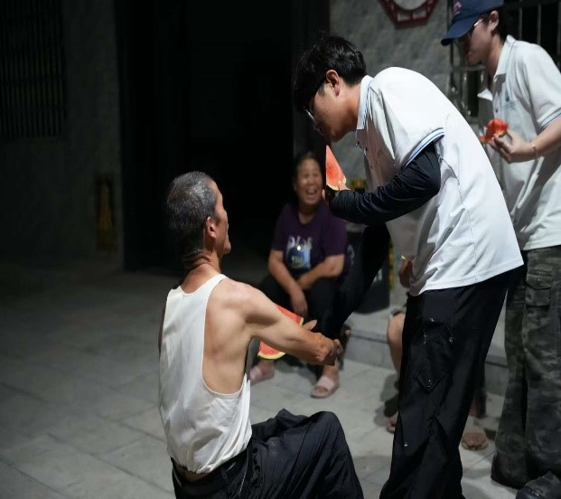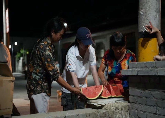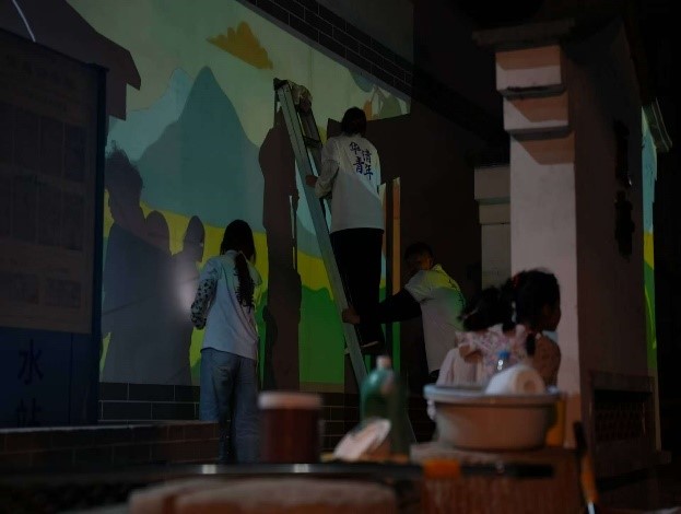 7月15日團隊成員抵達周一村的核心區域,該村最大的墻面繪畫作品無疑成為了最引人注目的焦點。然而,由于墻面的高度,團隊成員不得不搭建梯子進行作業,這無疑增加了工作的難度。盡管如此,他們并未表現出任何退縮之意,在40多度的高溫下,夜以繼日地投入到繪制工作中。在繪制過程中,他們反復比較整體與局部效果,細心調整每一處細節,以確保畫面的完美呈現。在繪制的間歇,西瓜成為了連接村民與團隊成員的紐帶,一塊塊切好的西瓜傳遞著村民的感激之情,老人與孩童接過西瓜時的感謝之語,伴隨著西瓜的甘甜,在夜晚的氛圍中逐漸醞釀出溫馨的氛圍。這一舉動不僅為村莊增添了色彩與活力,也進一步加深了實踐團與村民之間的信任與默契。