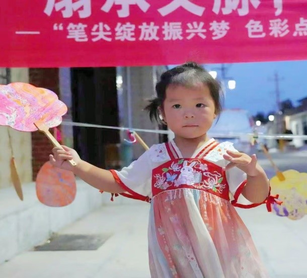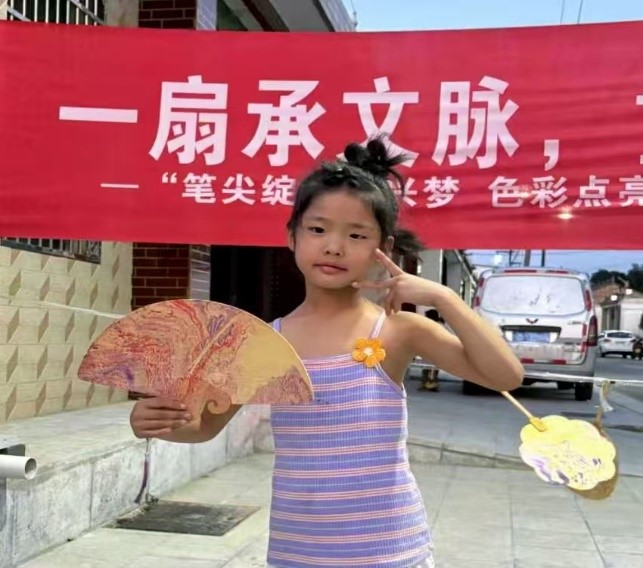 為了進一步豐富村民的精神文化生活,實踐團成員開展了非物遺文化小課堂活動。活動以“藝術為橋梁,漆扇為媒介”在周一村成功舉辦,建立了實踐團與周一村村民及兒童之間的溝通橋梁。