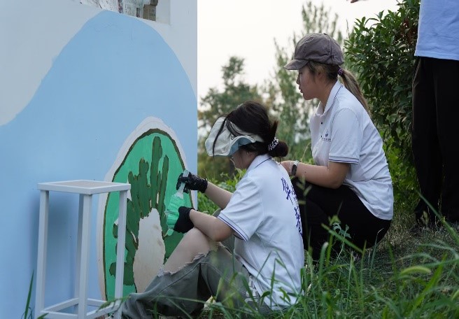 村落煥發出新的生機,實踐團的成員們利用繪墻之余,帶著工具集結于陳舊的墻體之下。鏟子與灰刀碰撞出清脆聲響,拉開了墻面修繕的序幕。有人弓著腰,用鏟子細細剝離墻皮上的霉斑與剝落層;有人踩著梯子,為高處的墻縫填補膩子,身影在光影里微微晃動。汗水浸濕了團員們的衣領,卻沒停下他們手中的活。斑駁的墻面在一遍遍刮抹中變得平整,裸露的磚石被細心遮蓋。