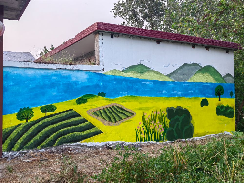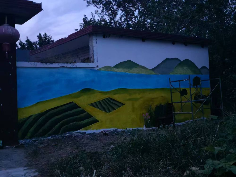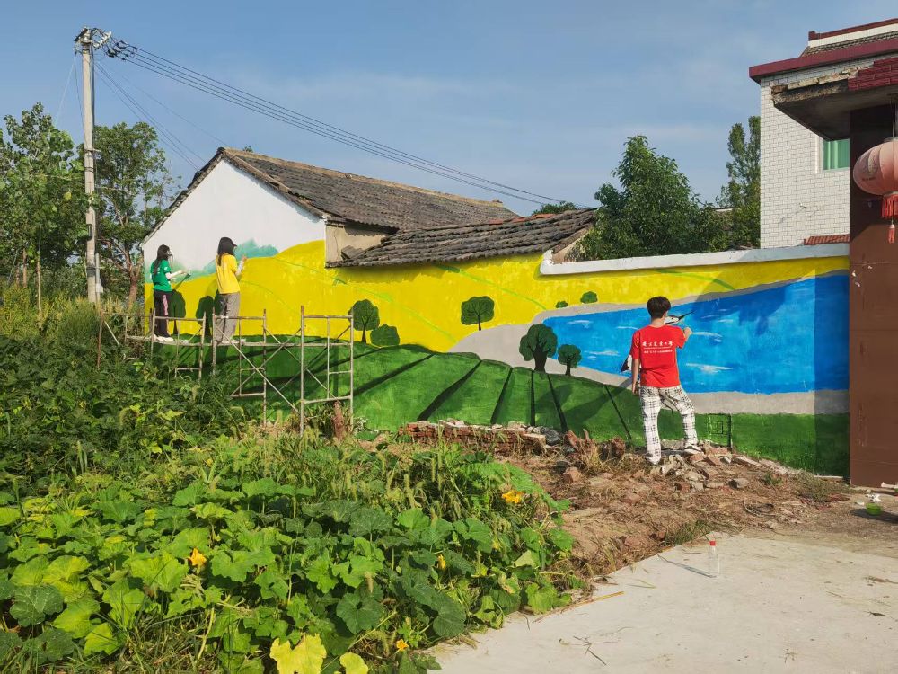 次日一早,實踐團成員早早集合,延續高效協作模式,集中精力推進整體繪畫。成員們默契配合,精準把控畫面構圖與色彩基調,將生態元素與鄉村景致的融合度進一步提升,快速完成了剩余墻面的整體繪制,為后續細節優化打下堅實基礎。