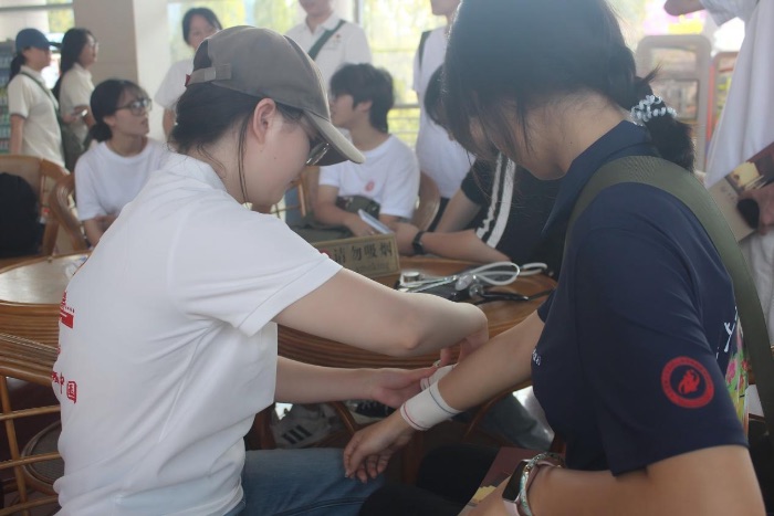 針對(duì)現(xiàn)代人常見(jiàn)的健康問(wèn)題,實(shí)踐隊(duì)還開(kāi)展了實(shí)用醫(yī)學(xué)知識(shí)宣講。在穴位按摩教學(xué)環(huán)節(jié),隊(duì)員詳細(xì)講解并演示了緩解疲勞的常用穴位及按摩技巧,邀請(qǐng)觀眾現(xiàn)場(chǎng)體驗(yàn),氣氛輕松活躍。隨后進(jìn)行的創(chuàng)傷包扎技能教學(xué)中,團(tuán)隊(duì)重點(diǎn)介紹了環(huán)形包扎法、螺旋包扎法的適用場(chǎng)景與操作步驟,并對(duì)不同打結(jié)方式進(jìn)行比較說(shuō)明,幫助觀眾掌握基礎(chǔ)急救技能,獲得了廣泛好評(píng)。