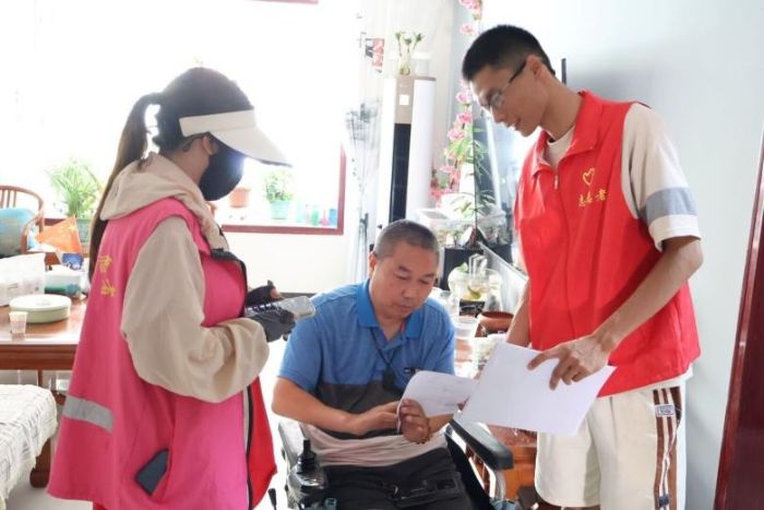 圖為實踐團隊員與第三師圖木舒克市167社區訪談居民對電信詐騙的了解度。李雨蒙 供圖